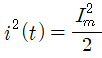 위와 같이 쓸 수 있습니다. 여기서 cos2ωt와 i(t)의 주기가 2배 차이나므로 i(t)의 반주기의 시간에 대해 cos2ωt는 1주기가 됩니다. 정현파의 1주기 평균값은 0이므로 cos2ωt의 평균값은 0도 됩니다. 반주기에 대해 전류의 제곱은 아래와 같습니다.