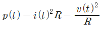 위와 같은 관계가 성립합니다. 교류전력이 일을 할 때는 사인파형에 대한 평균치가 아닌 사인파를 제곱한 값의 평균값에 대한 제곱근 값, 즉 실효값을 구해야 합니다. 임의의 부하 R과 연결된 교류전원 v(t)가 있을 때, 흐르는 전류 i(t)의 실효값을 구해봅시다.