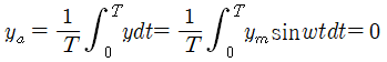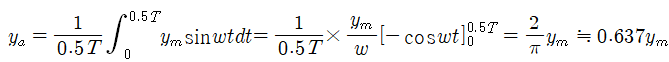 정현파의 파형은 1주기에 대해 양의 면적과 음의 면적의 합이 같습니다. 만약 1주기 전체에 대해 함수를 적분하여 평균값을 구한다면 그 값은 0이 될 것입니다. 따라서 정현파의 평균값은 부호를 고려하지 않고 파형을 적분한 반주기 평균값을 사용합니다. 이를 식으로 나타내면,