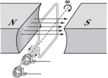 위 발전기의 원리를 나타낸 그림을 봅시다. N-S극의 자석으로 표현된 일정한 자기장 내에서 코일을 회전을 시킵니다. 이때 페러데이의 전자유도법칙에 의해 코일에는 유도기전력이 발생하게 됩니다.