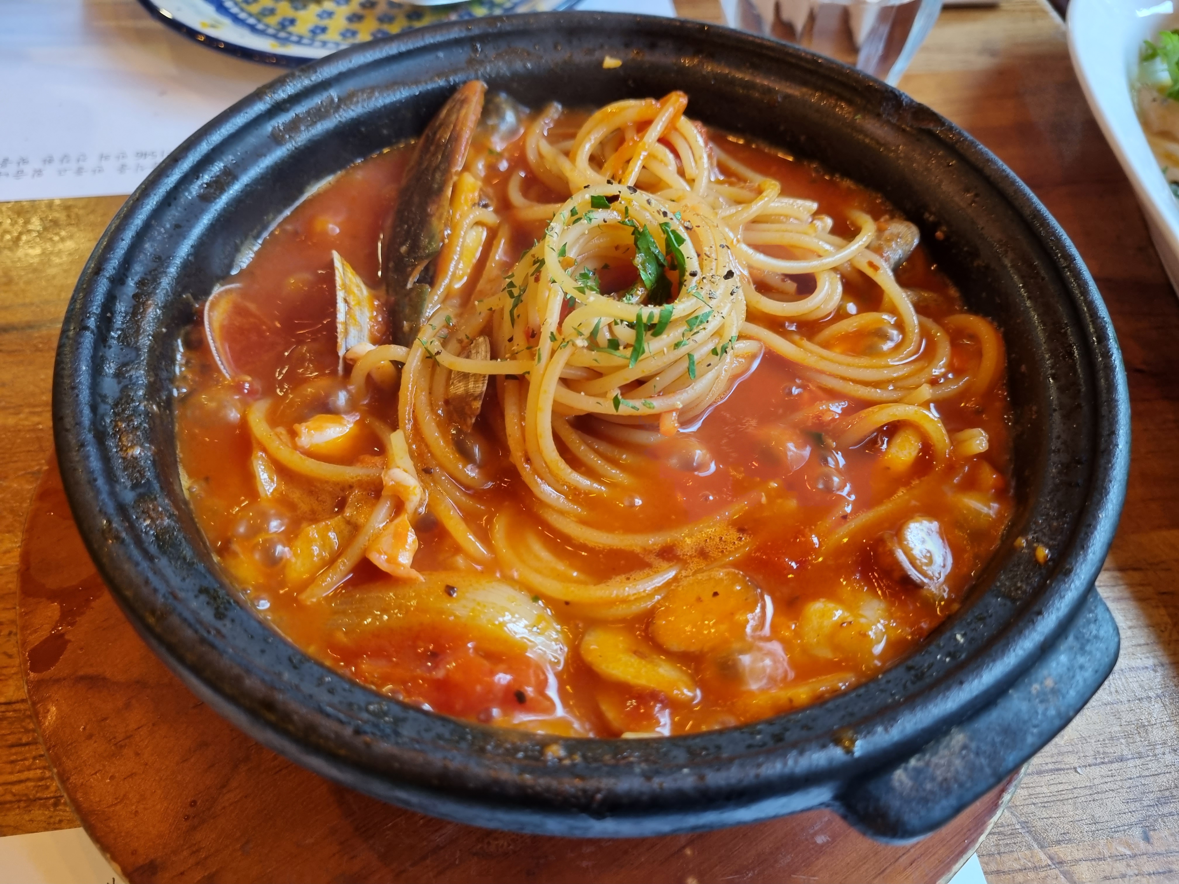 해산물 토마토스튜 파스타는 팔팔 끓는 상태로 나옵니다. 국물이 있는 매콤한 파스타를 원하면 제격입니다. 국물파스타 류가 오일파스타나 다른 메뉴보단 양이 많은 편이라 먹고나면 배가 든든합니다.