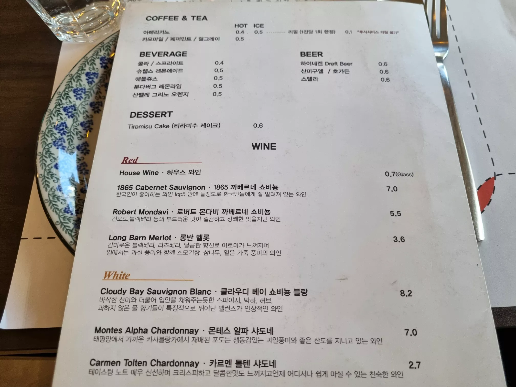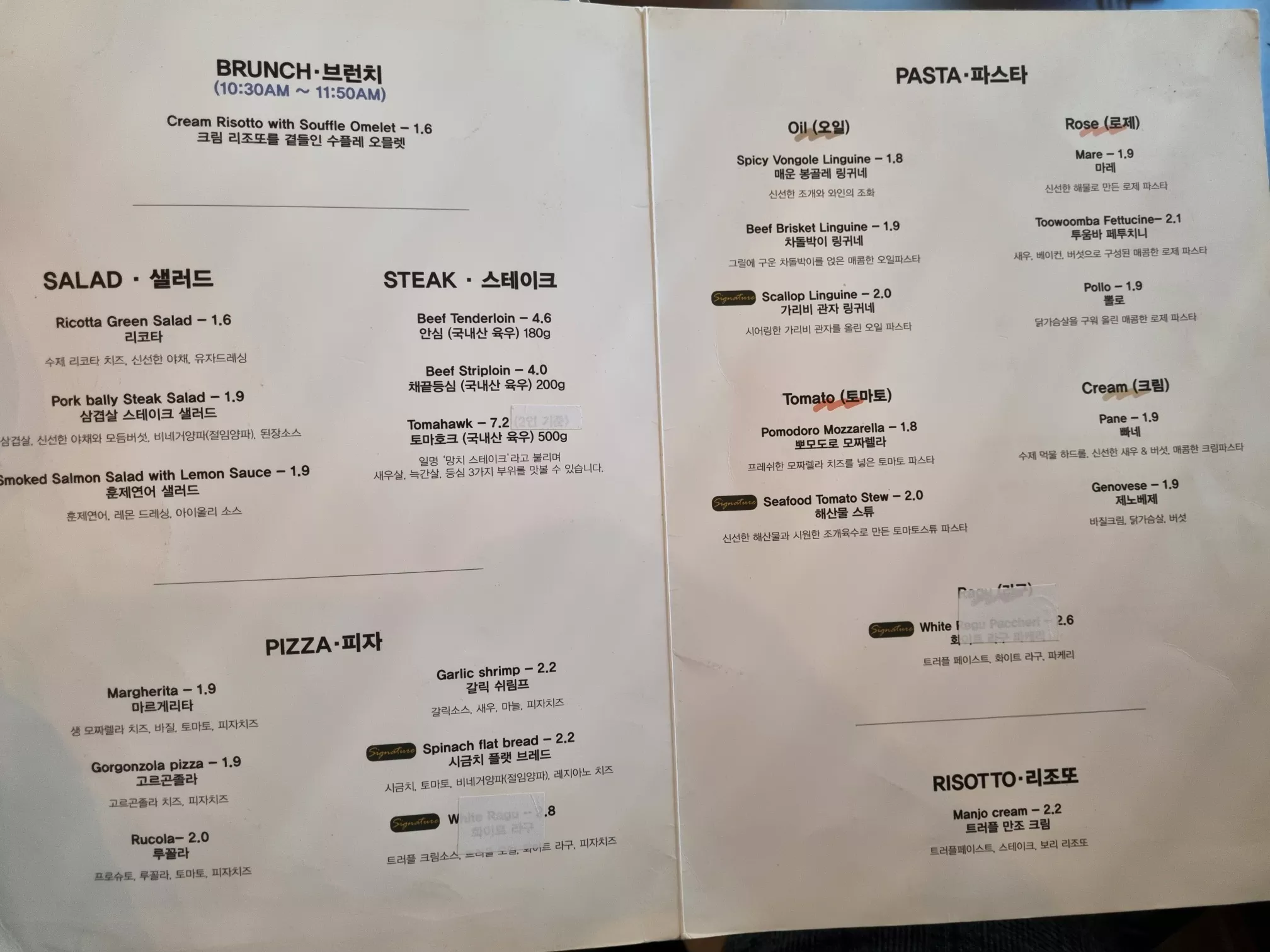 메뉴는 생각보다 간소합니다. 식사메뉴로는 샐러드, 스테이크, 피자, 파스타, 리조또가 있습니다. 가장 유명한 메뉴는 삼겹살 스테이크 샐러드, 시금치 플랫 브레드, 가리비 관자 링귀네, 해산물 스튜입니다. 다른 손님들도 이 4가지 메뉴를 가장 많이 시키는 것 같네요.