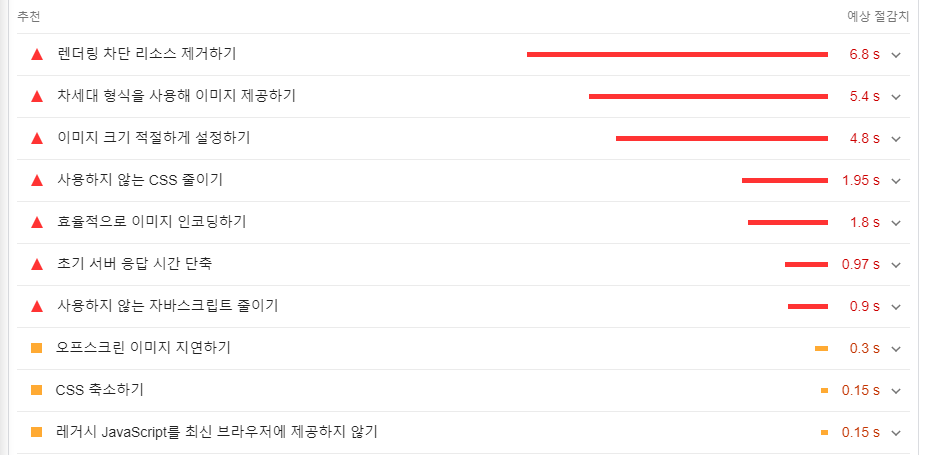 성능 문제 진단하기 항목에 성능점수와 함께 개선할 수 있는 방법들이 제시되어 있습니다. 추천 사유는 해당 옵션마다 절감할 수 있는 데이터 전송량과 예상 시간치로 판단하여 제시된 것입니다. 오프스크린 이미지 지연하기 등 다양한 방법들이 있습니다. 그중에서 사용하지 않는 자바스크립트 줄이기를 봅시다.