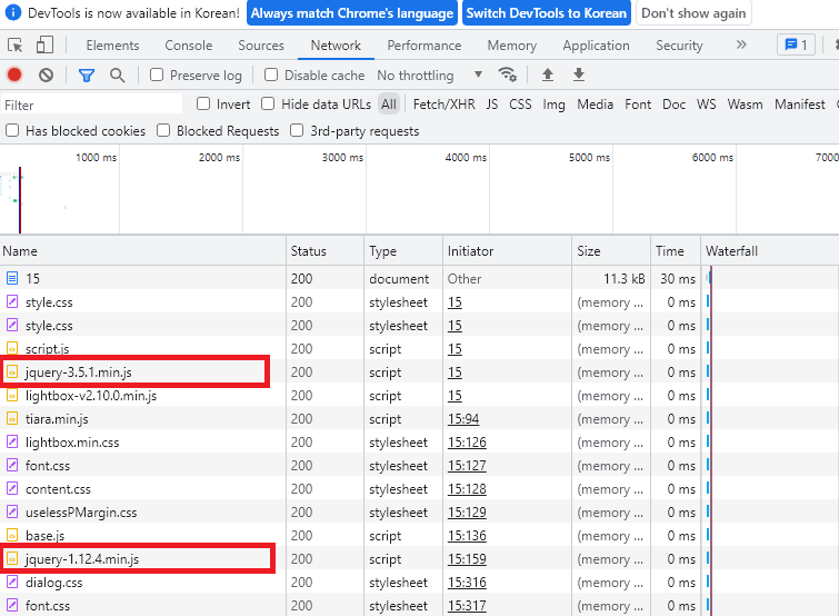 구글 크롬의 개발자 도구를 통해 블로그 웹페이지를 살펴봅시다. 네트워크 항목을 보면 웹페이지가 로드될 때 어떤 파일들이 로딩되는지 확인할 수 있습니다. 그런데 jQuery가 2개가 로딩됩니다. 바로 3.5.1 버전과 1.12.4 버전입니다. 왜 그럴까요?