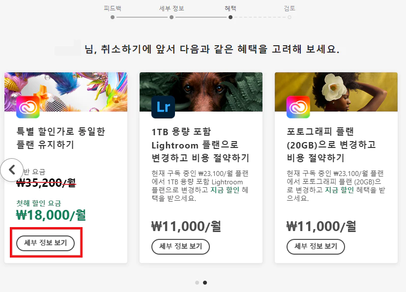 두 번째는 매월 결제금액 18,000원 할인 혜택입니다. 1년간 결제금액은 216,000원입니다. 1년간 서비스를 사용한다면 당연히 18,000원 옵션이 더 유리합니다. 특별 할인가로 동일한 플랜 유지하기에 대해 세부 정보 보기 버튼을 누릅니다.
