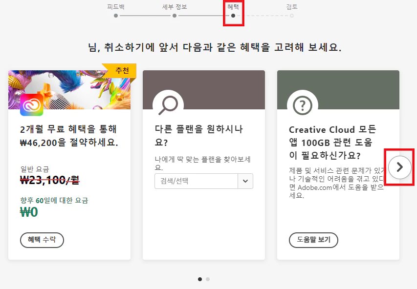 왜 플랜을 해지하는지 피드백을 입력하는 내용입니다. 아무거나 선택해도 됩니다.