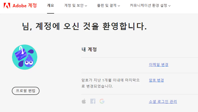 먼저, Adobe 계정에 로그인한 후 위와 같이 계정관리 페이지로 접속합니다.