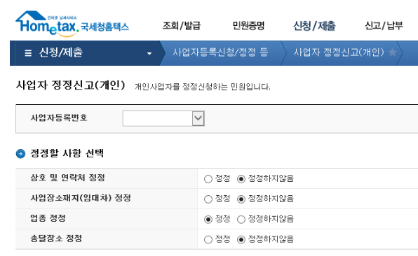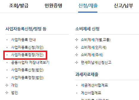 메뉴 중에서 신청/제출을 선택하고, 사업자등록정정(개인)을 찾습니다. 여기서 개인은 개인사업자를 의미합니다. 법인이라면 사업자등록정정(법인)을 선택해야겠죠.