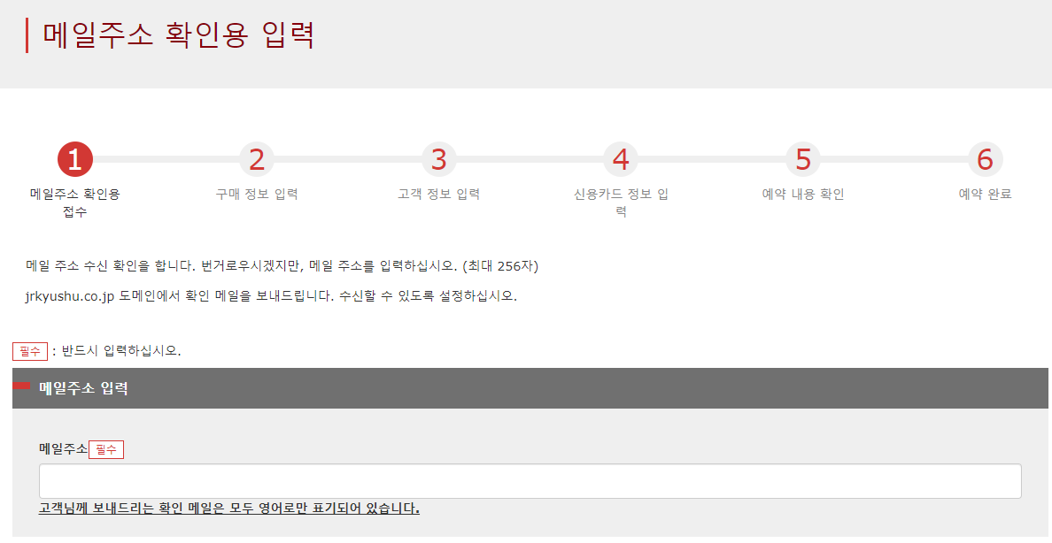 별도 회원가입 없이 메일주소를 통해 예약이 가능합니다. 그래서 메일주소를 입력하고, JR큐슈에서 발신된 확인메일을 수신하여 인증하시면 됩니다.