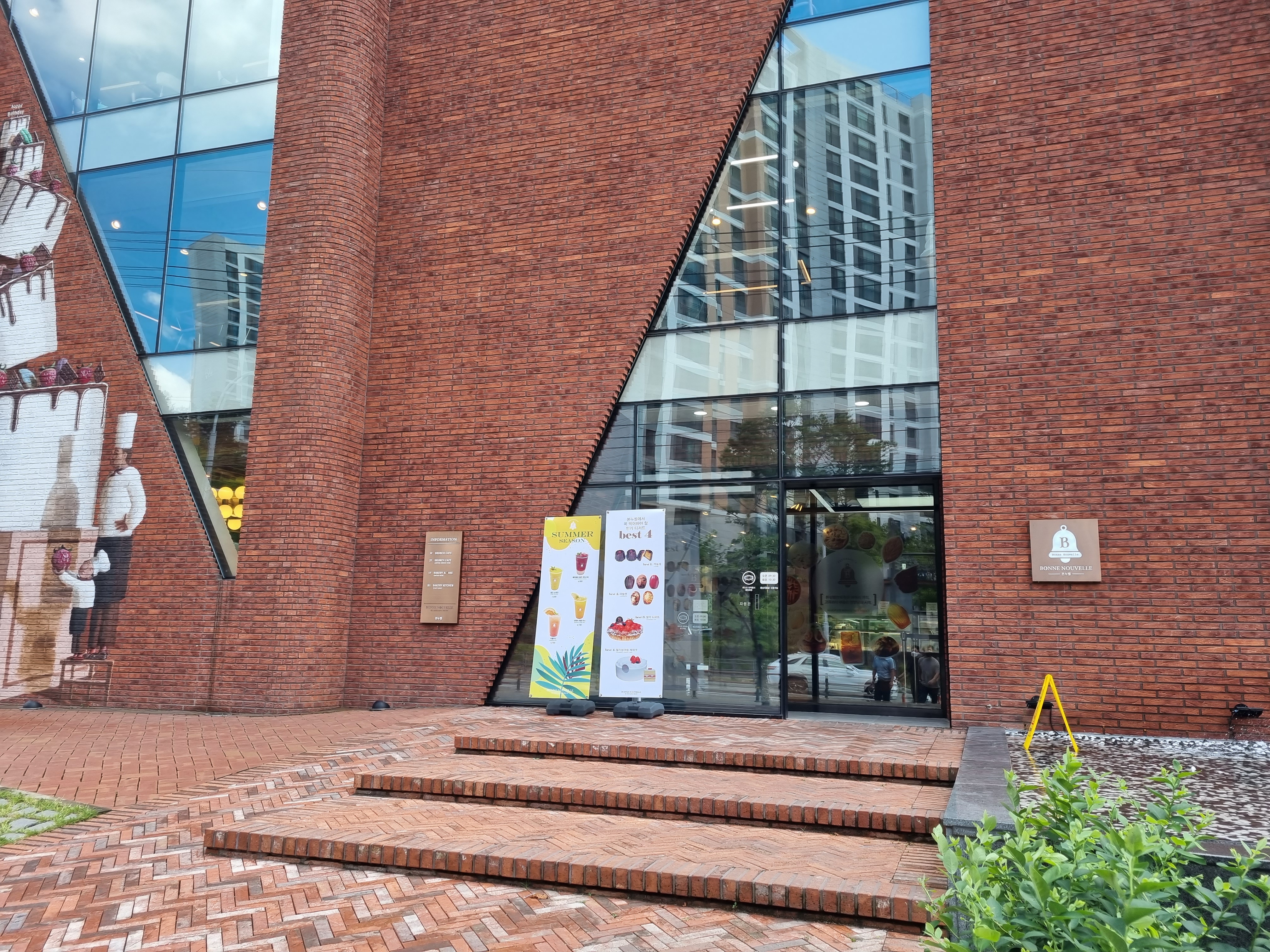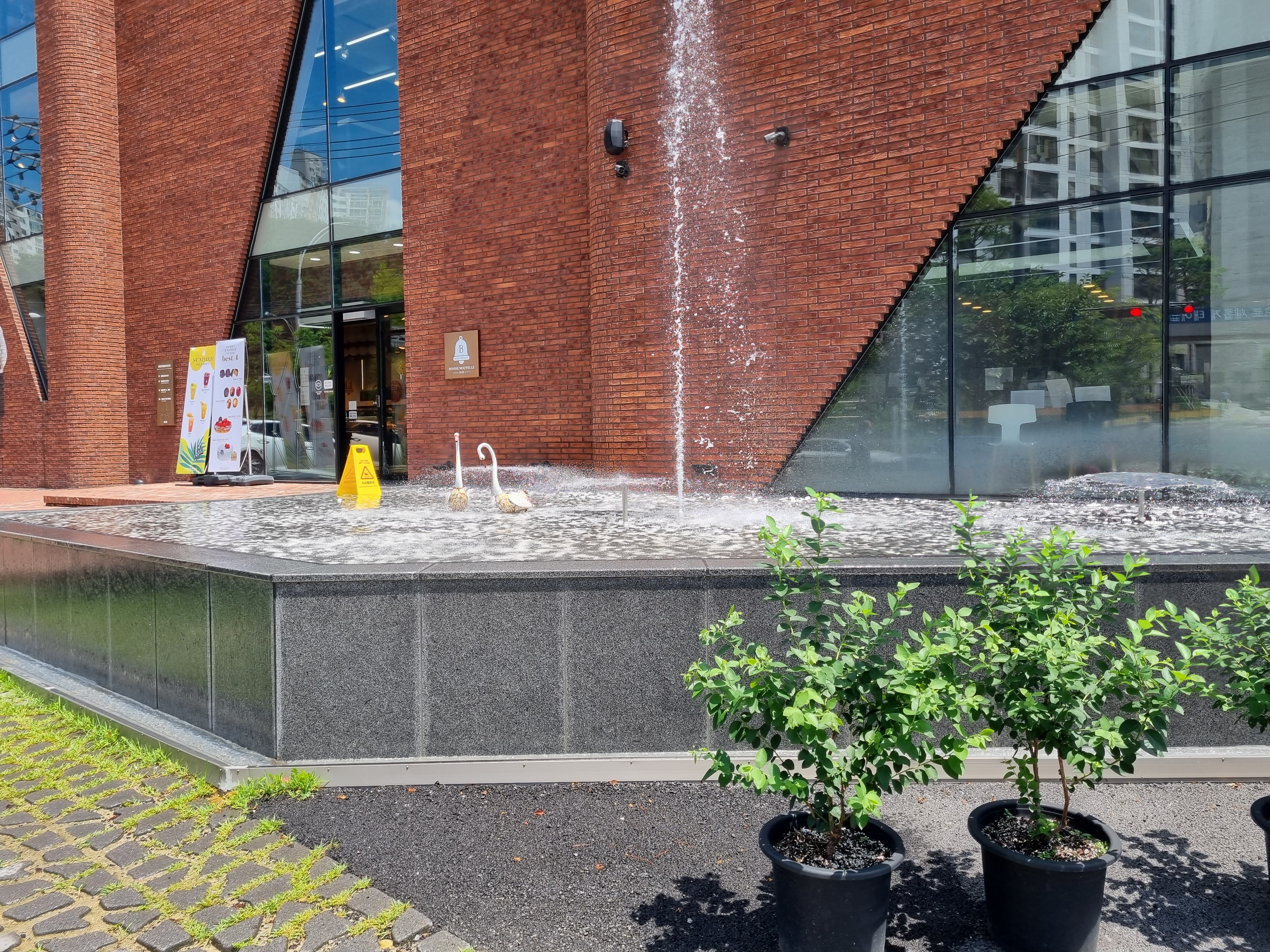 건물의 외장재는 빨간벽돌을 사용했다. 안쪽으로는 통유리로 구성되어서 개방감이 매우 좋다. 입구 바닥도 빨간 벽돌이라서 들어갈 때도 기분이 좋다. 입구에는 분수가 있어서 시원하다.