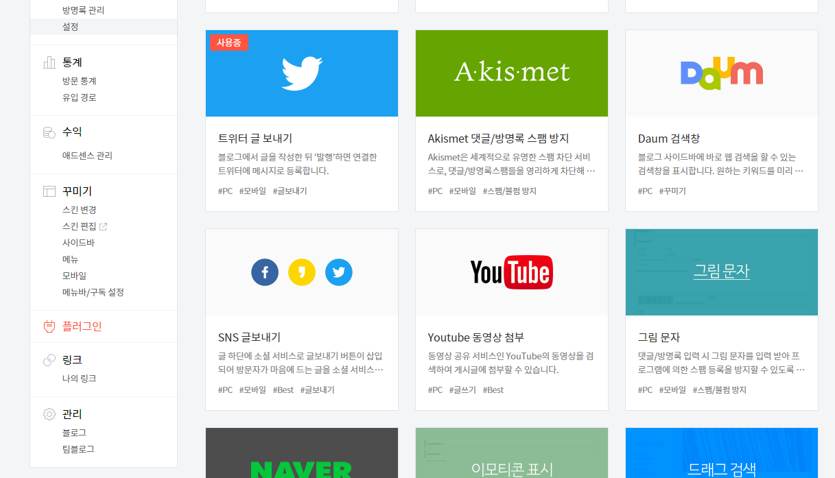 티스토리 블로그 관리 메뉴에서 플러그인 항목으로 들어갑니다. 그러면 "트위터 글 보내기"라는 항목을 확인할 수 있습니다. 지금은 적용이 된 상태지만 적용이 되지 않은 상태여도 화면은 동일합니다.