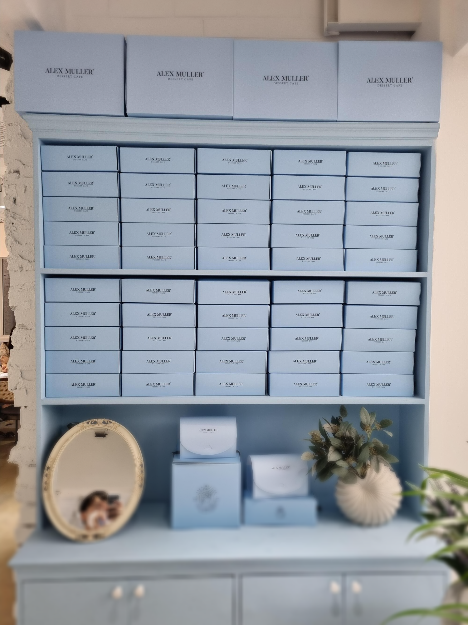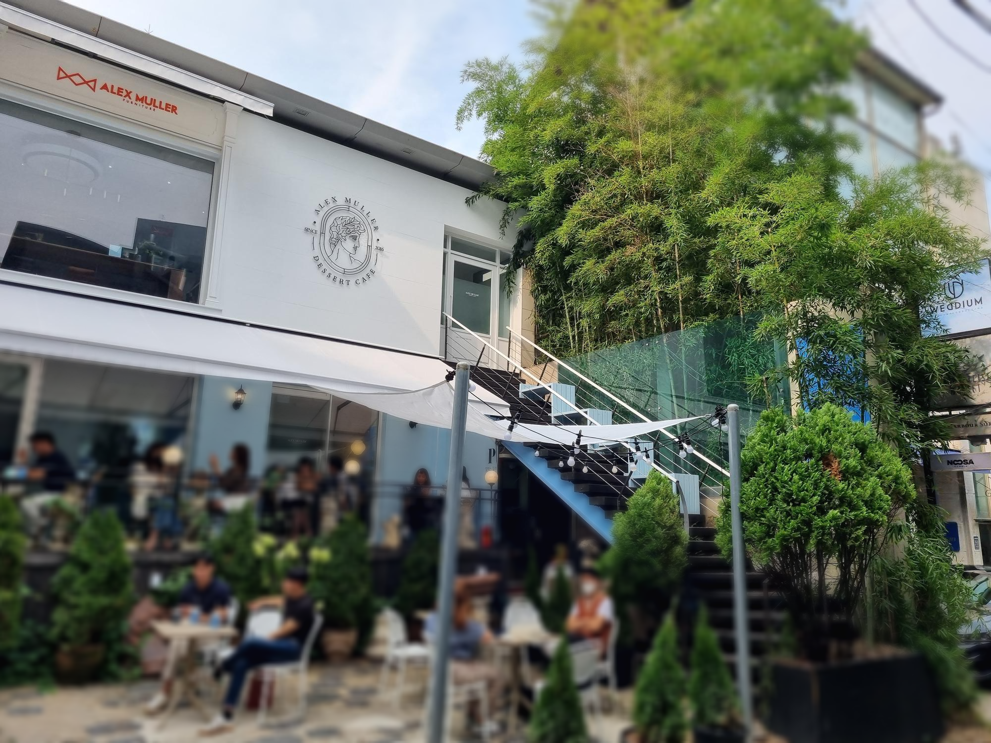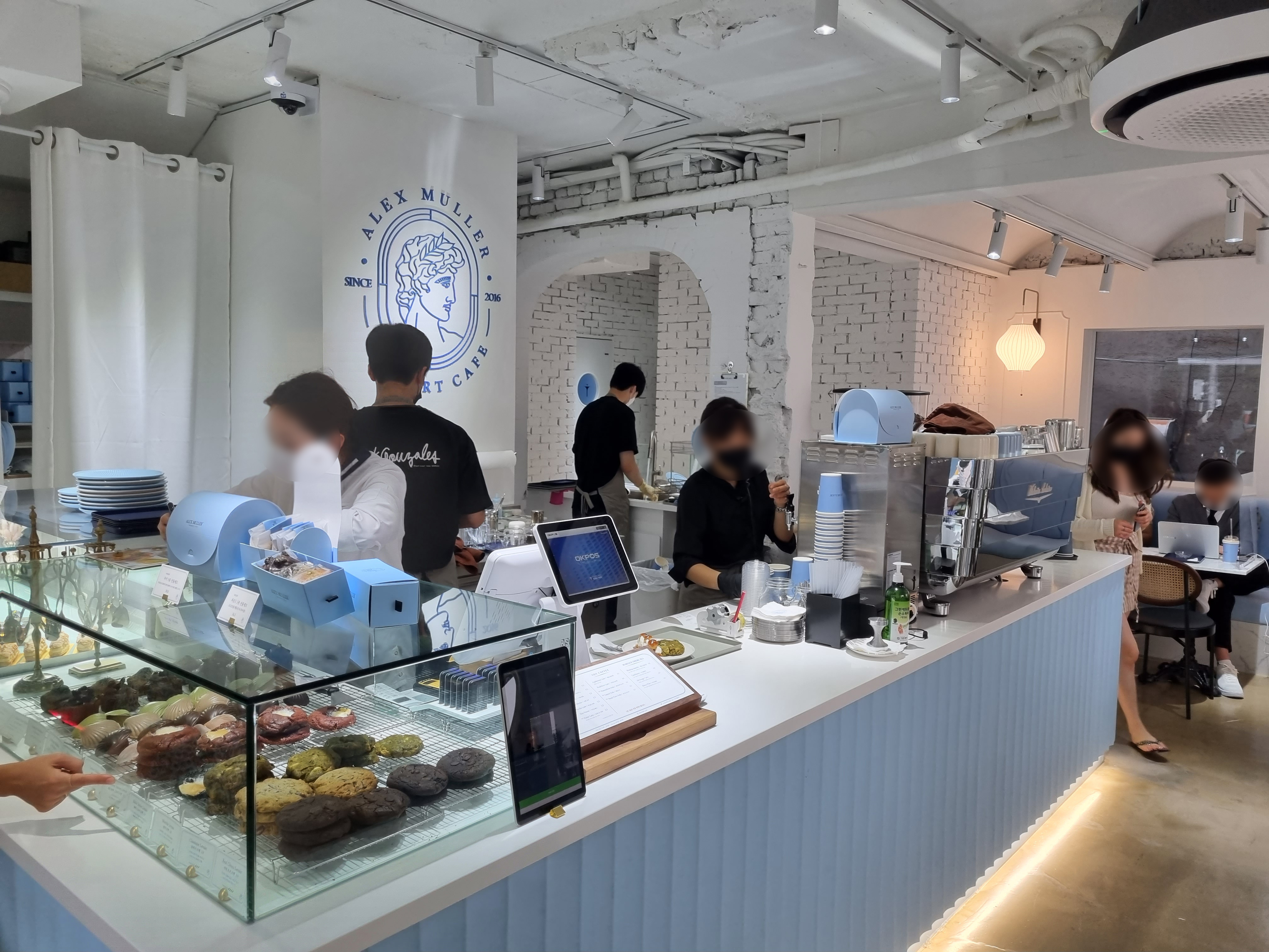 카페 알렉스뮐러의 시그니처 컬러는 연한 파랑색인듯하다. 로고는 쨍한 오렌지인데, 조화롭기 어려운 두개의 색을 화이트를 전반에 배치하고 포인트로 활용하여 예쁘다. 주변에는 회색 일변도의 무채색의 건물들이 많은데, 하늘색을 써서 눈에 띈다. 프랑스 디저트 전문이라고 하며, 브런치도 판매한다. 외부에 테이블을 놓아서 밖에서 도산공원의 녹음을 함께 보아 즐거웠다.