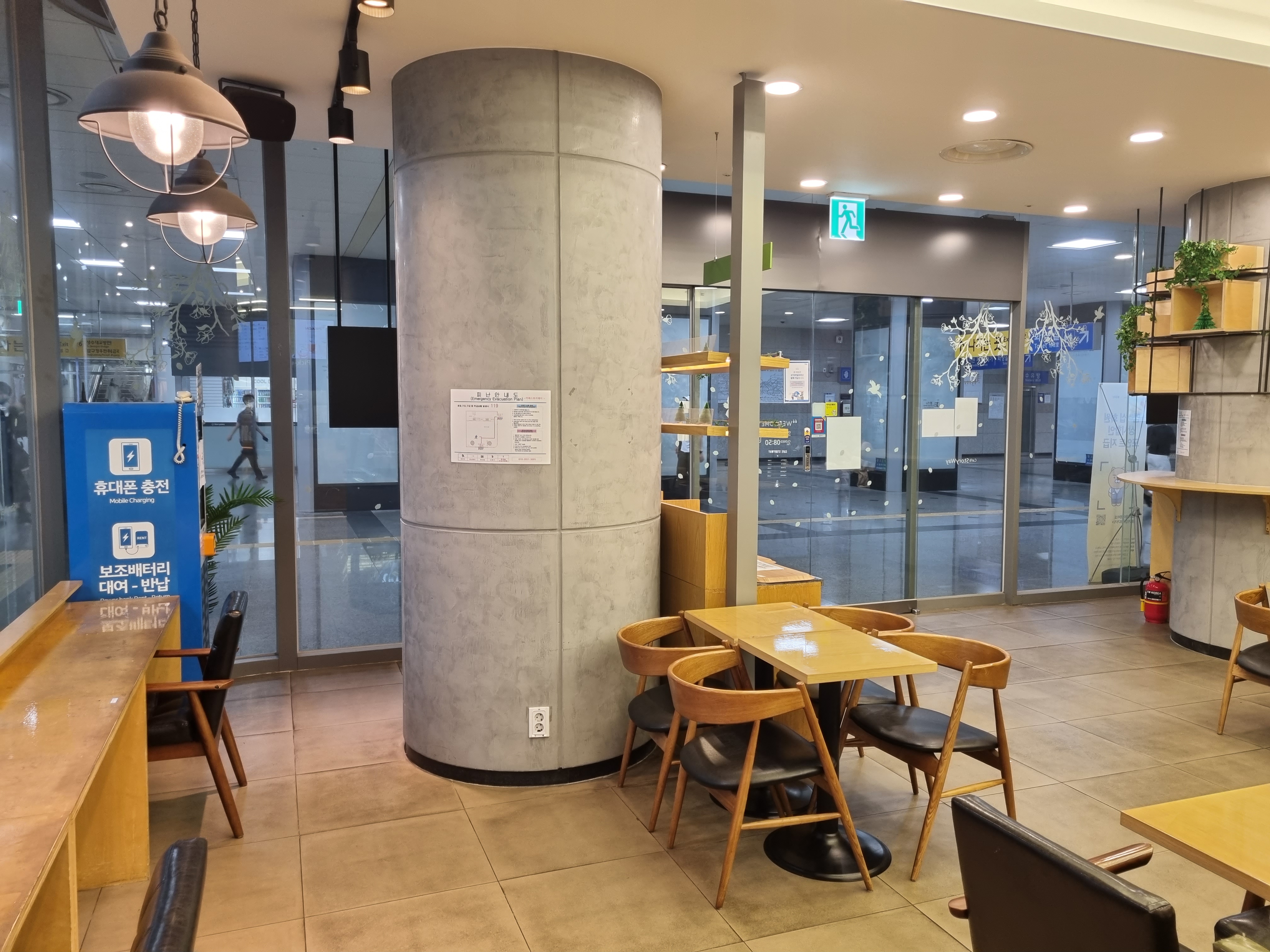 휴대폰 충전을 위한 공간도 있습니다. 개별 좌석마다 콘센트가 있어서 노트북이나 휴대폰을 충전하면서 앉아 있을 수 있고, 휴대폰 충전용 기계도 있는데 현재는 점검중인 상태네요.